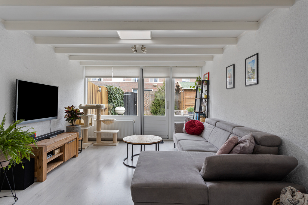 Sfeervolle uitgebouwde woonkamer met veel natuurlijk daglicht door de grote raampartijen, beschikt over een laminaatvloer en openslaande deuren naar het terras en de achtertuin.