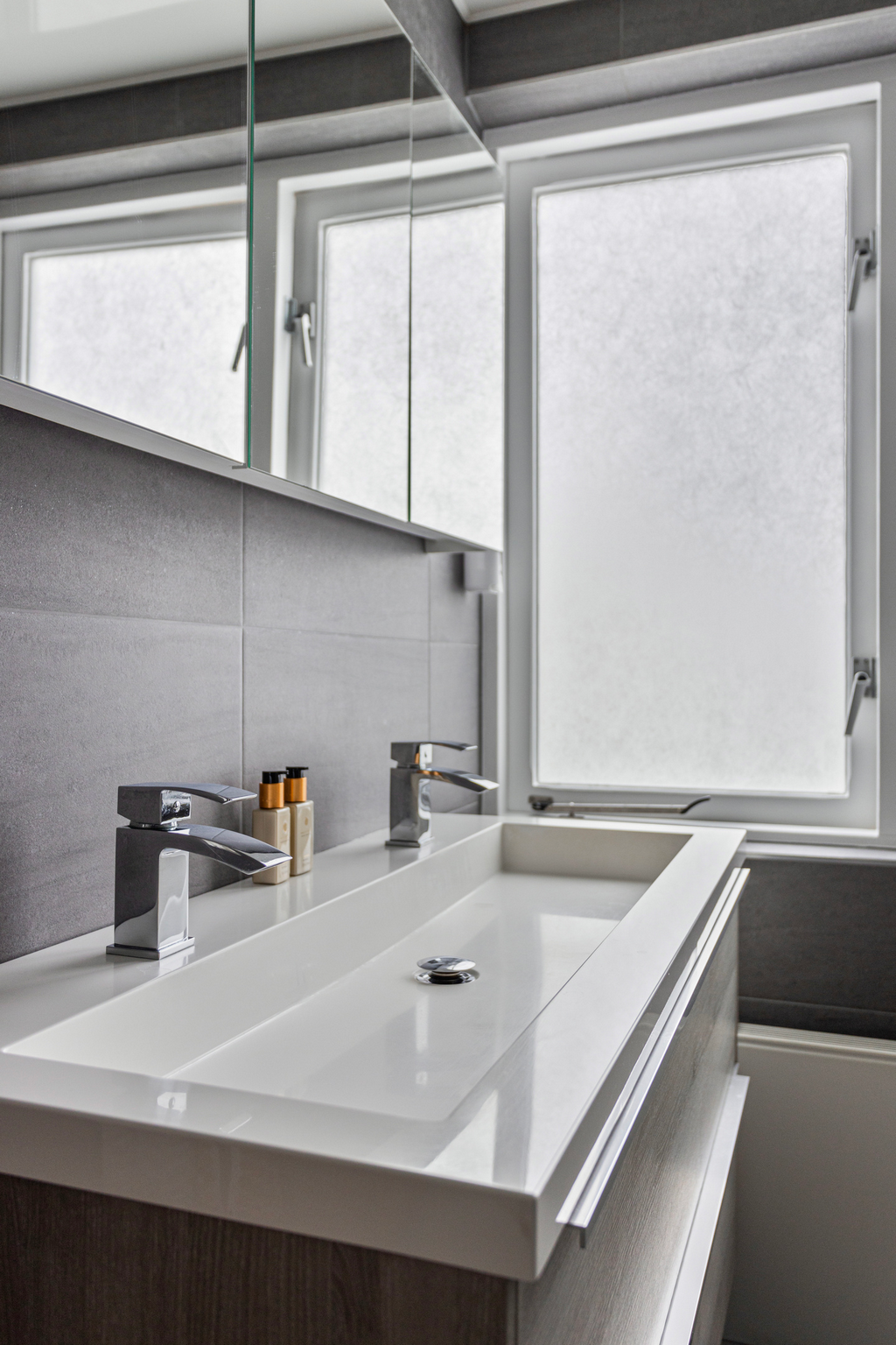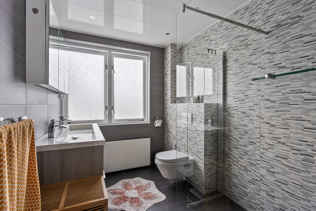 Moderne badkamer voorzien van een ruime inloopdouche, dubbele wastafelmeubel en een toilet.