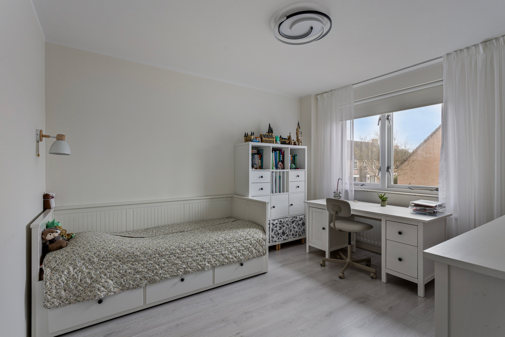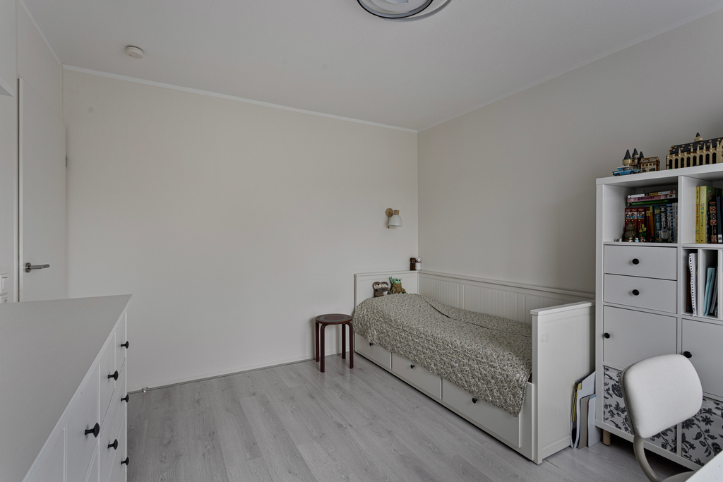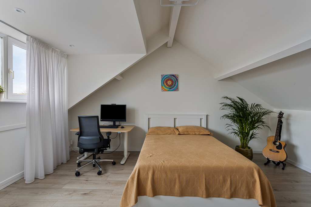 Royale vierde slaapkamer voorzien van een laminaatvloer en een dakkapel.