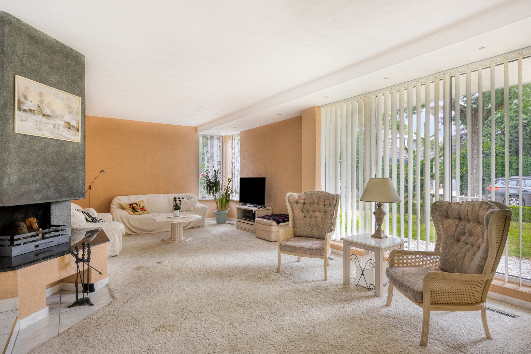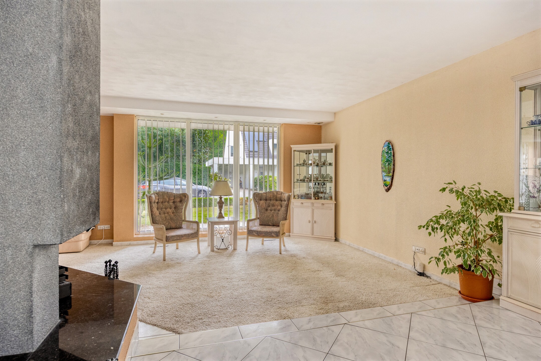 De living is opgedeeld in een zithoek aan de voorzijde en een open keuken met eetgedeelte aan de achterzijde. De zithoek is gelegen in een verlaagde leefruimte en biedt dankzij grote raampartijen van veel daglicht. Daarnaast beschikt de zithoek over een tapijtvloer en een open haard.
