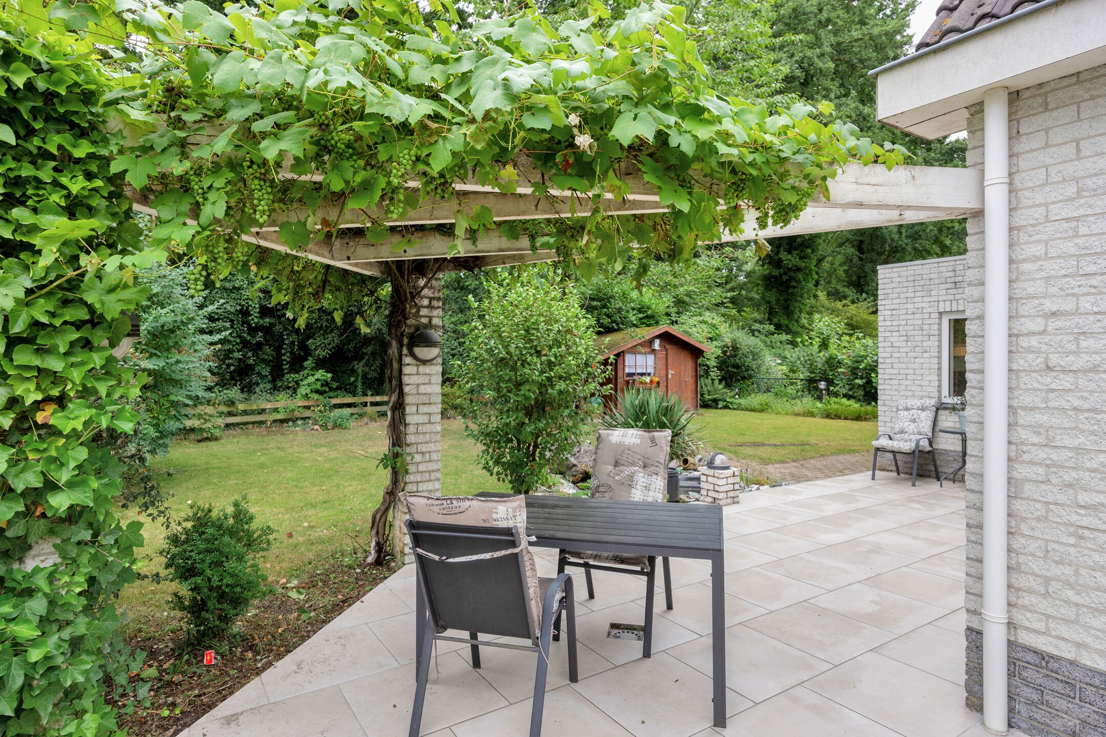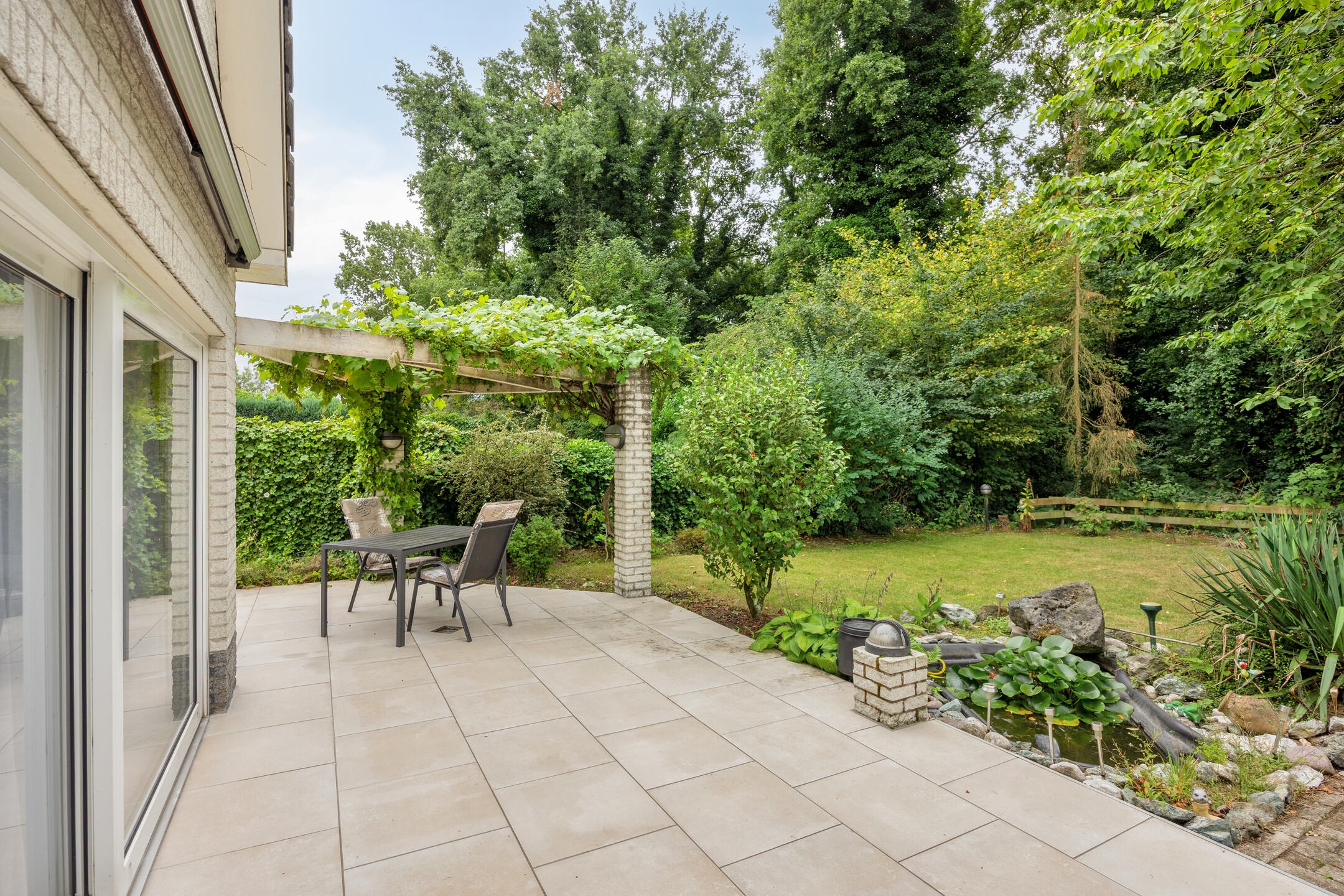 De fraai aangelegde achtertuin grenst direct aan een natuurgebied en biedt hierdoor optimale rust en privacy. De tuin is voorzien van een terras met elektrische zonneluifel, een groen gazon, een vijver, twee eigen achterommetjes en een houten berging.