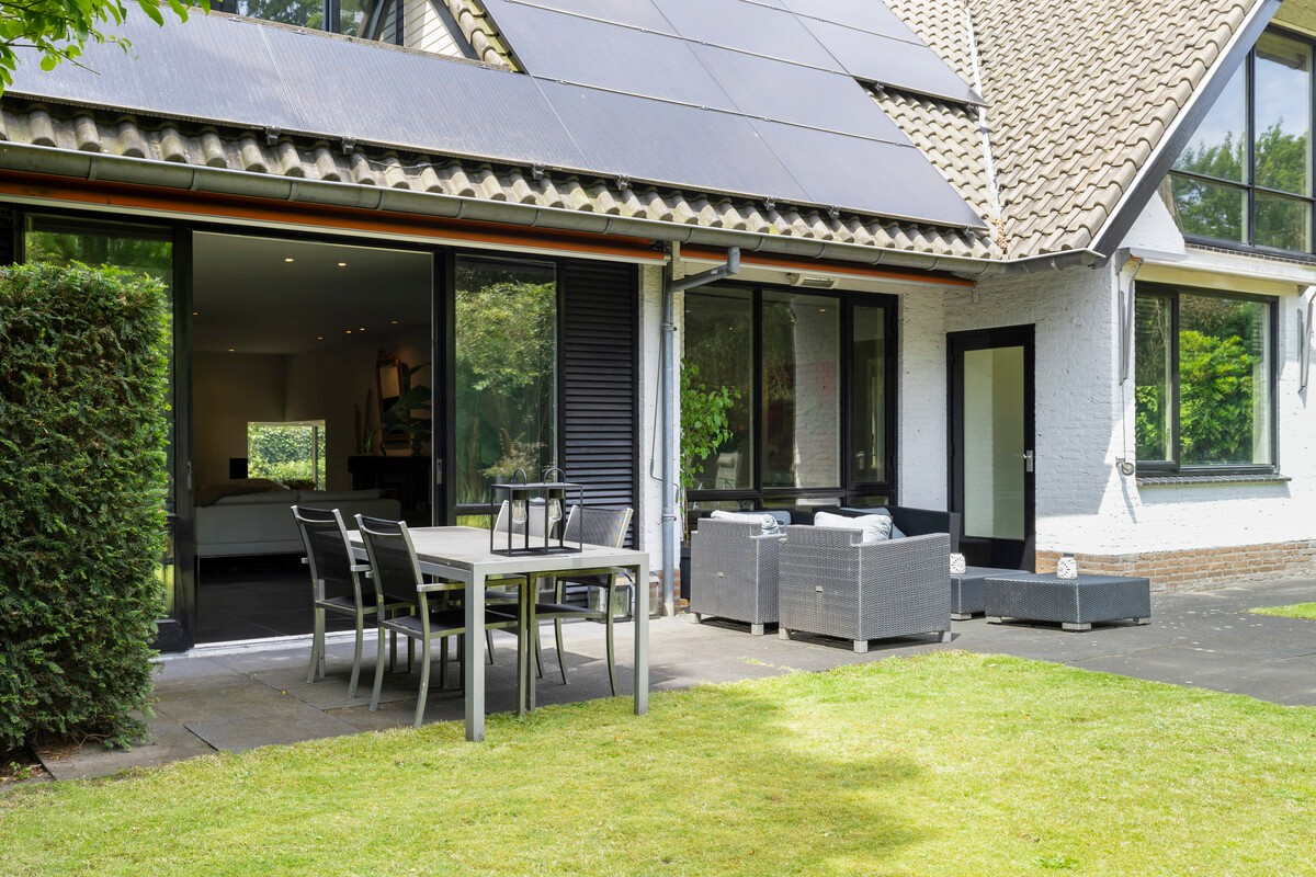 The garden comprises various mature perennials, trees and shrubs, a spacious lawn and paving. Through the sliding doors in the living room, you have access to the terrace, which has 3 awnings and a heat lamp. There are also various seating areas on the west side of the garden.