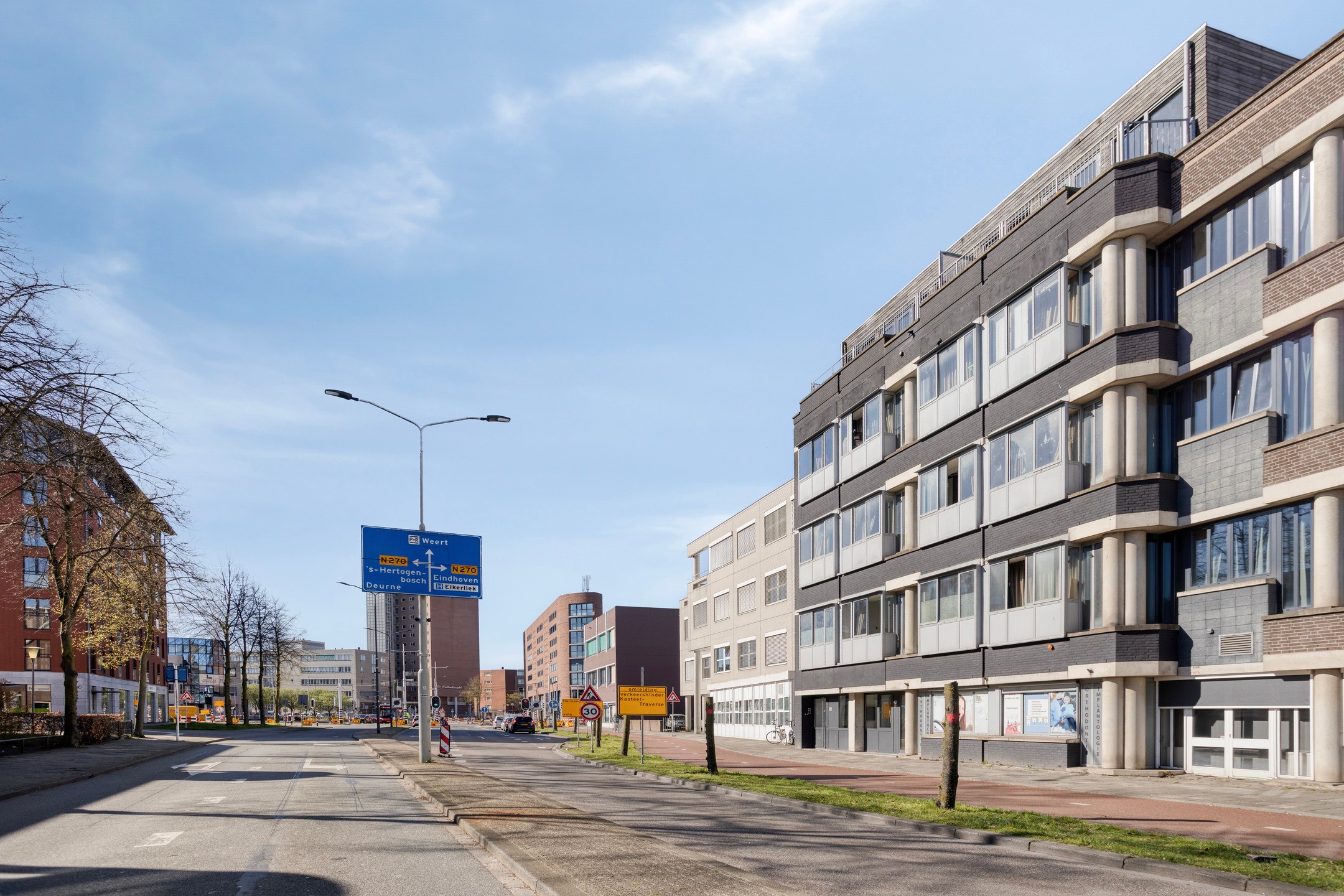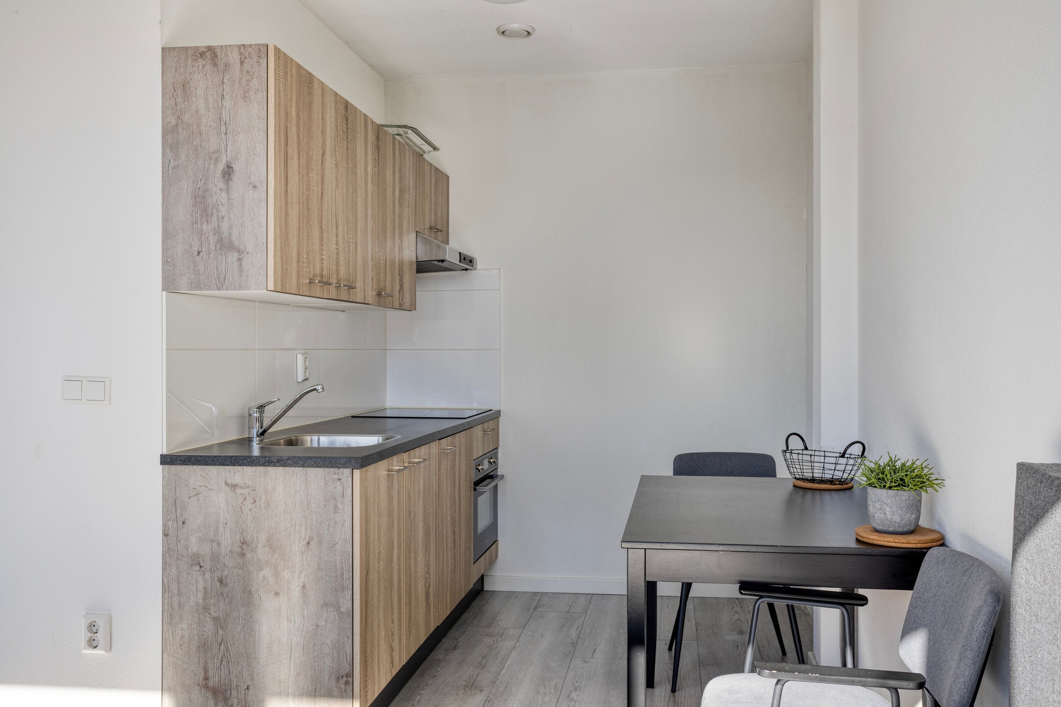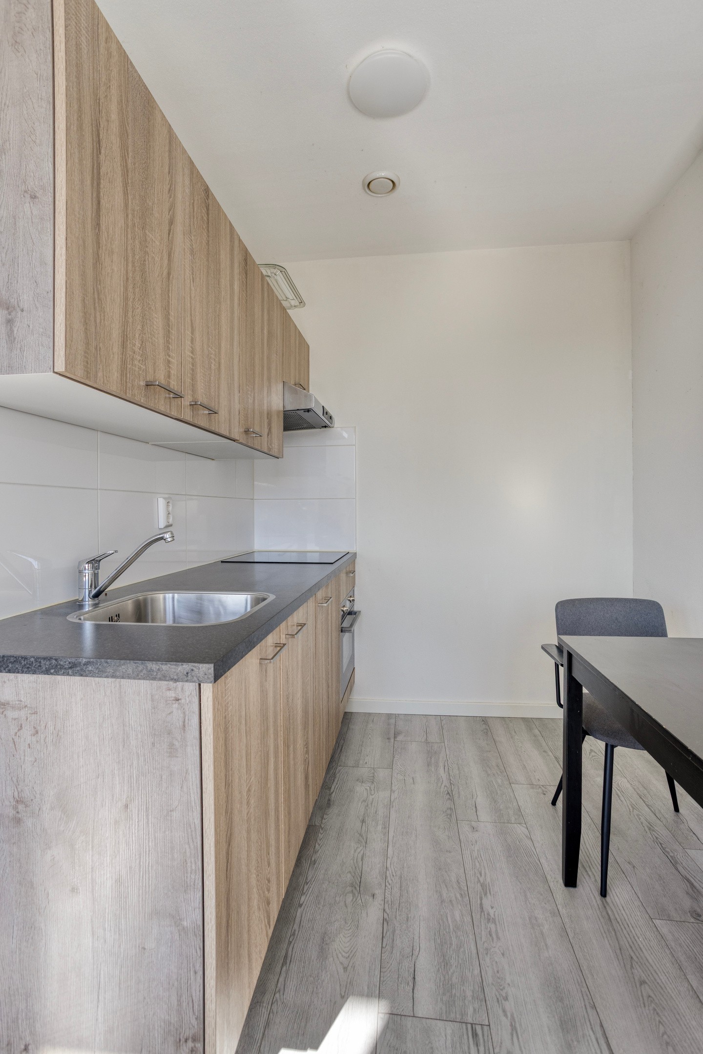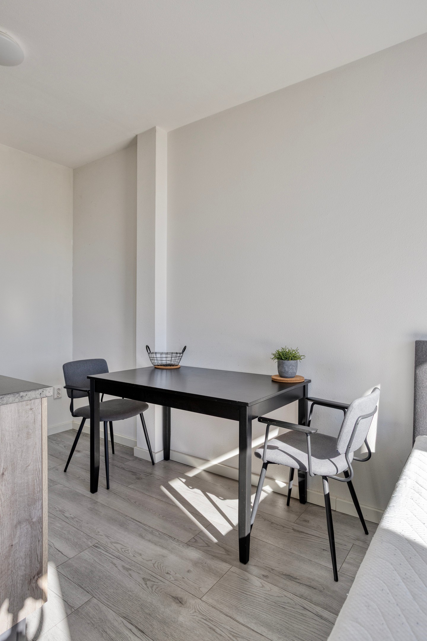 De woonruimte is afgewerkt met een laminaatvloer en ingericht met een tweepersoonsbed, eettafel, kledingkast, grote fauteuil, tv-meubel en televisie. Vanuit de studio heb je toegang tot een ruim balkon, waar je prettig buiten kunt zitten en kunt genieten van een mooi uitzicht over Helmond.